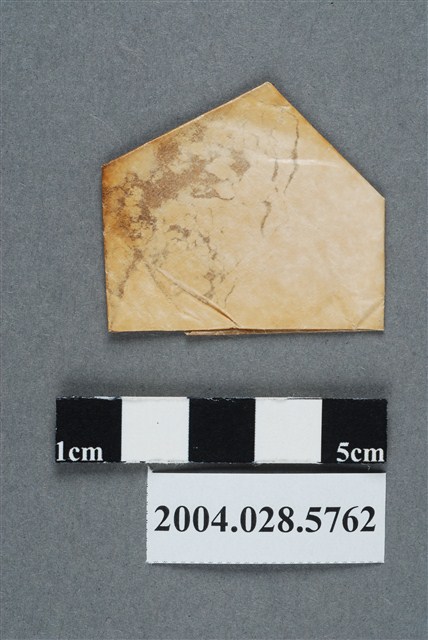本物件為紙藥包。外觀泛黃,有黃漬,無字樣和圖案。藥包折成上方斜角尖形,下方為方形的外觀。