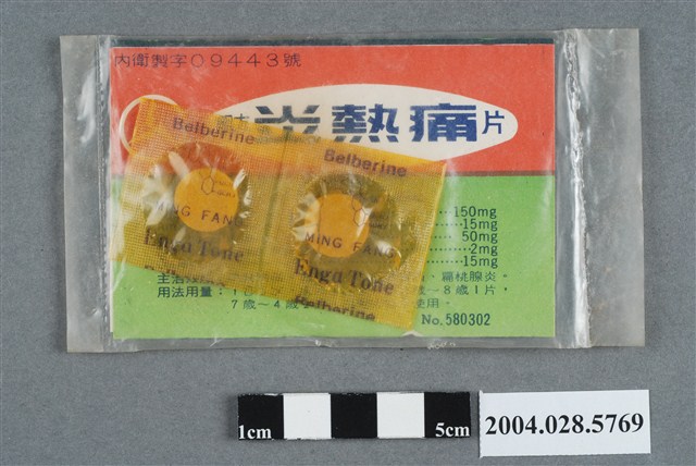 1. 本物件為炎熱痛。外包裝為塑膠袋,內有說明物件和藥片包裝。說明物件應為紙製品,封面印有明方、新消炎解熱止痛藥、炎熱痛片和炎熱痛,以及三張圖片,分別代表消炎、退熱和止痛。背面被藥片包裝遮住部分字樣,可見商標、明方炎熱痛片和內衛製字09443號字樣,以及主治效能、用法用量和成分內容。內有2片藥片包裝,藥片被透明膠膜包住,其上印有Enga Tone、MING FANG和Belberine字樣。