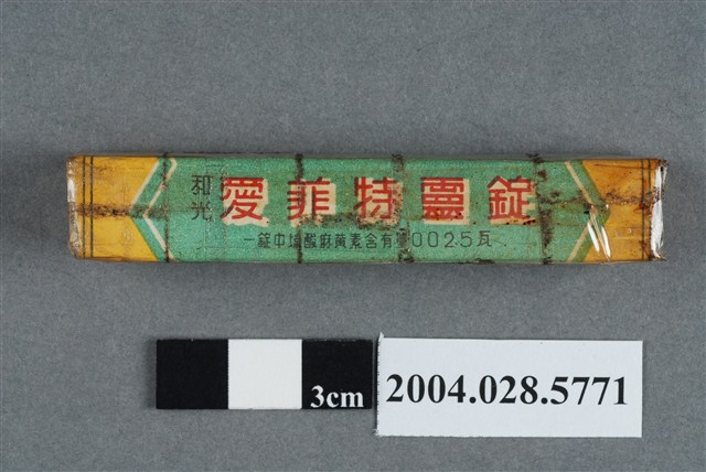 2. 本產品印有衛字3453號,應為二戰之後的產品,但在衛生福利部食品藥物管理署查無此藥資料。