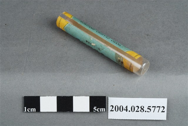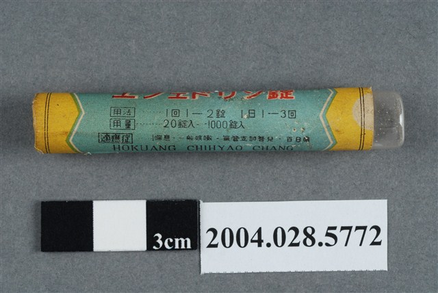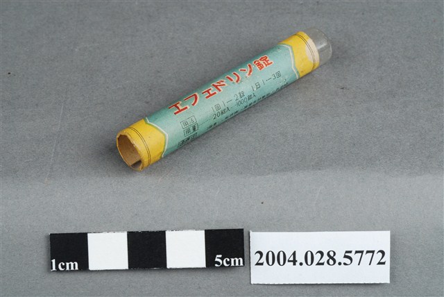 1. 本物件為愛菲特靈錠。包裝為長條圓柱狀,透明柱狀物外層包有標籤。標籤印有エフェドリン錠、鹽酸麻黃青錠、衛字3453號、HOKUANG CHIHYAO CHANG和適應症:喘息、一般咳嗽、氣管支加答兒和百日咳等字樣,以及用法用量內容。