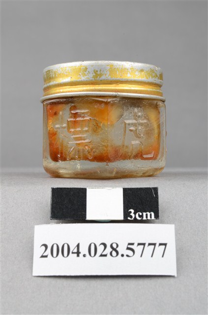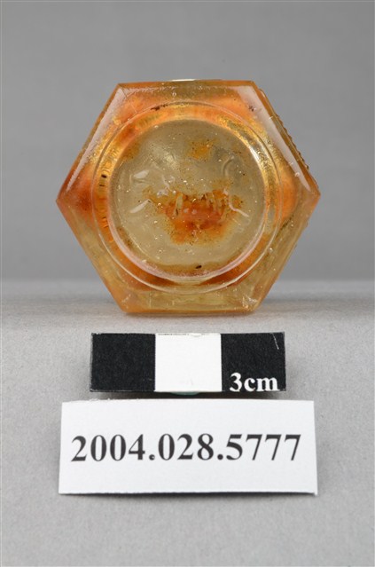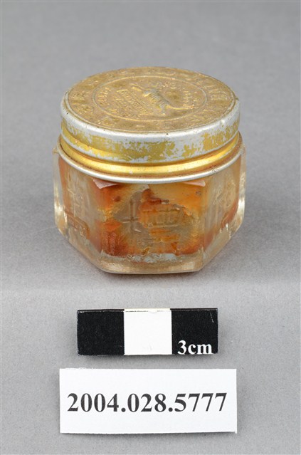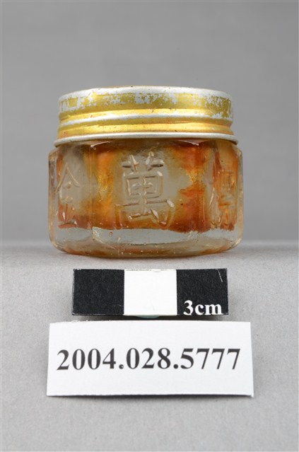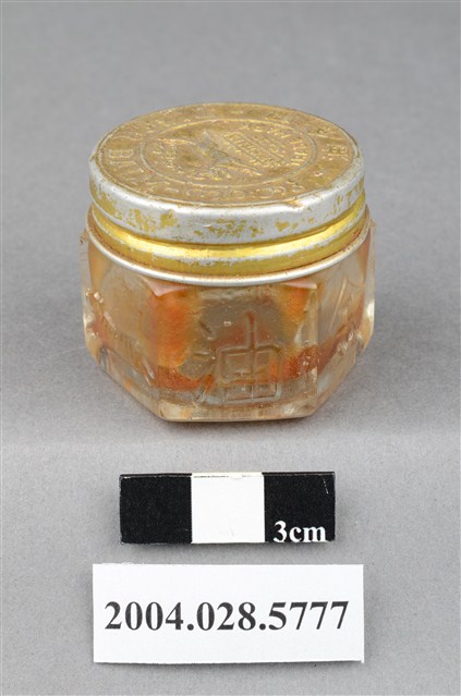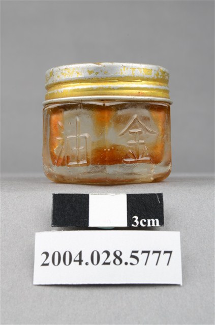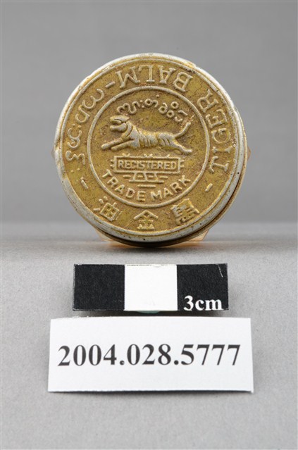 1. 本物件為虎標萬金油。蓋子為金色,瓶身為透明,可見瓶內物質。蓋上有凸起字樣,有萬金油、TIGER BALM和其他文字,另中間有老虎圖案。瓶身為六角型,虎標萬金油各字占一面,第六面為老虎標誌。瓶底亦有老虎標誌。
