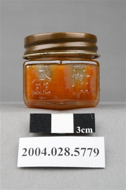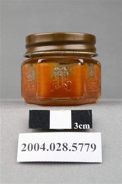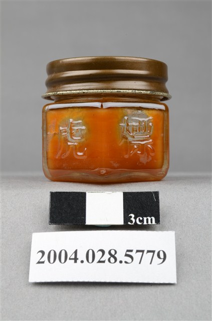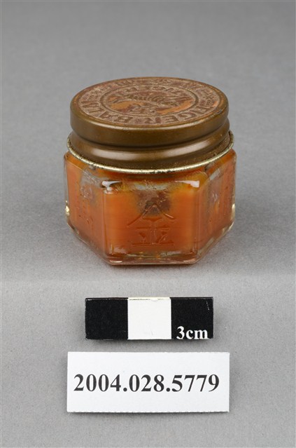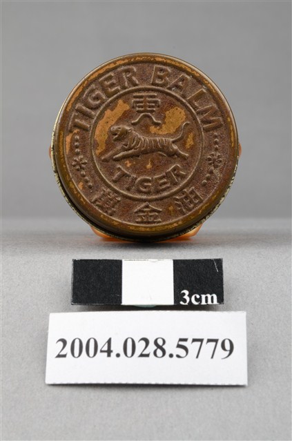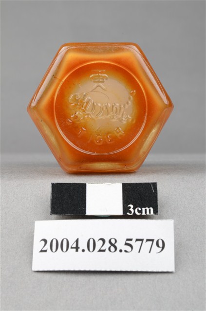 1. 本物件為虎標萬金油。蓋子為深棕色,瓶身為透明,可見瓶內物質。蓋上有凸起字樣,為萬金油和TIGER BALM,另中間有老虎圖案。瓶身為六角型,虎標萬金油各字占一面,第六面為老虎標誌。瓶底亦有老虎標誌。