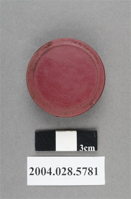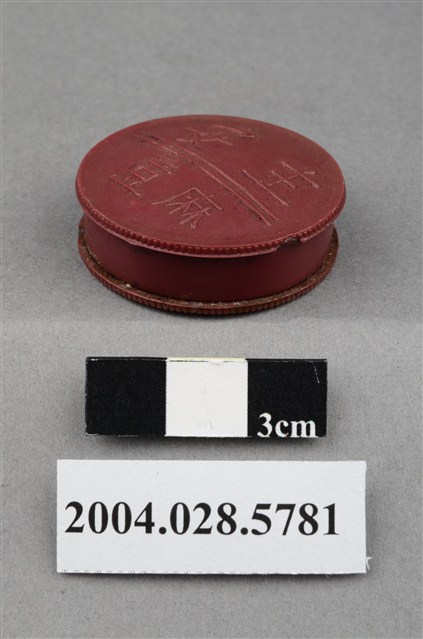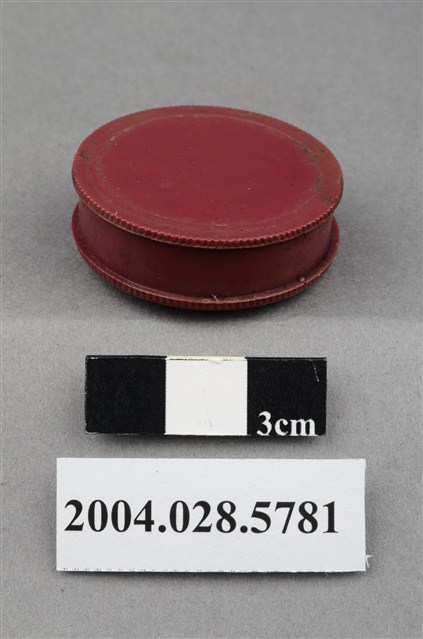本物件為麻豆主安塑膠製藥盒。藥盒為深紅色,扁平圓盒。盒蓋上有主安和麻豆凸起字樣,主安疑為醫院或診所名稱。盒底無圖樣和文字。