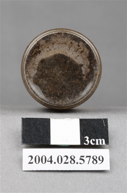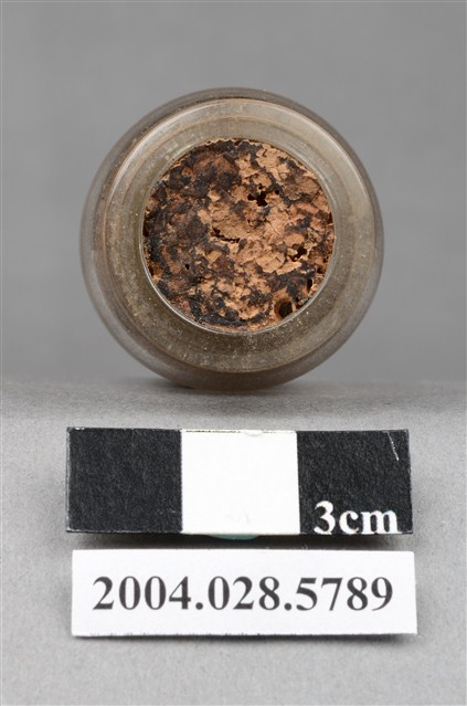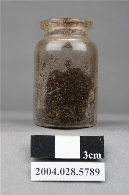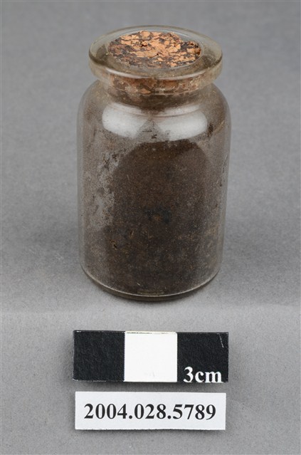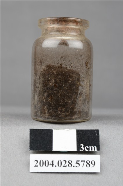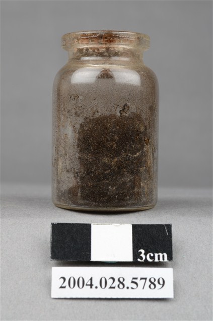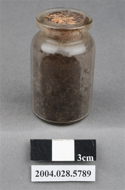 本物件為瓶裝藥粉。瓶身為透明無色,瓶塞為木質。瓶身上無文字與圖樣,瓶內有深色團狀物質。