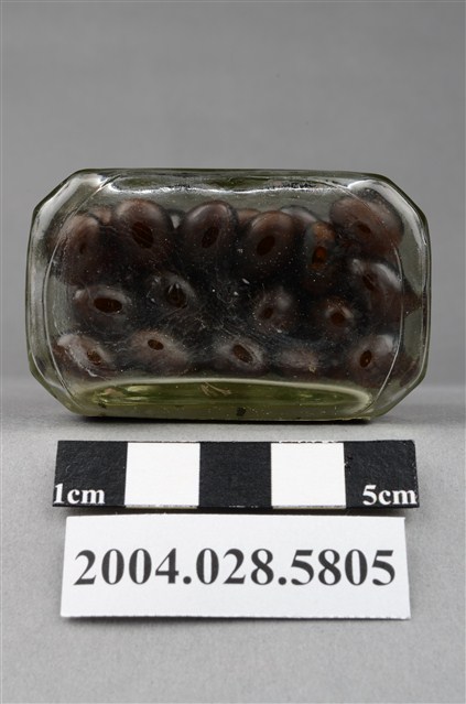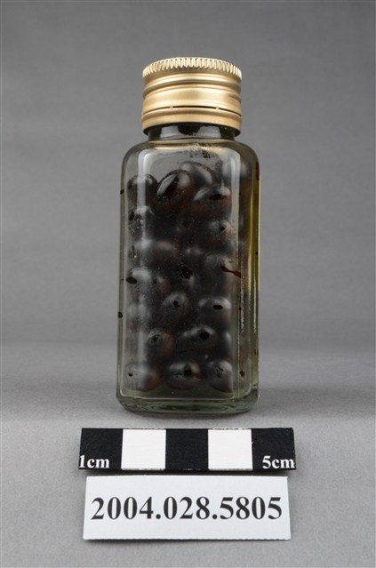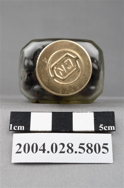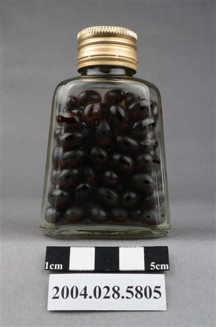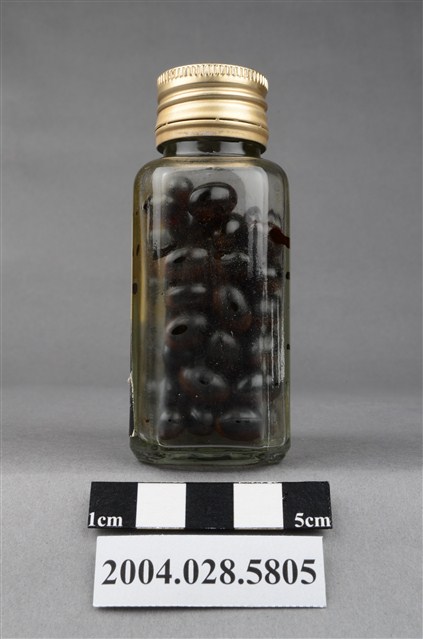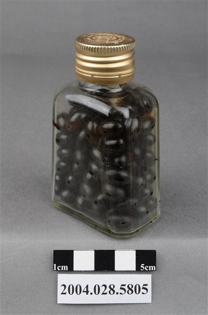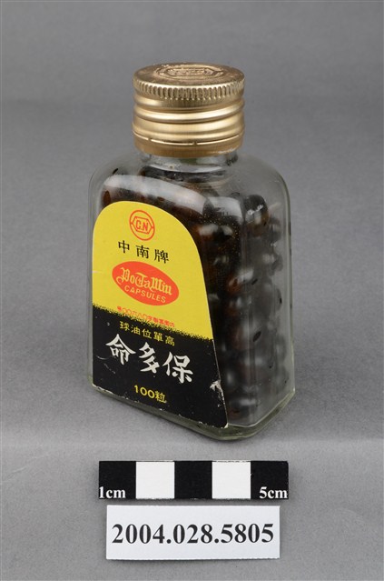 1. 本物件為保多命高單位油球。藥瓶身為透明無色,瓶蓋為金屬製,其上有CN凸起字樣。瓶身貼有標籤,其上印有中南牌、內衛藥製字08600號、保多命高單位油球和100粒等字樣。瓶內有深色晶球丸。