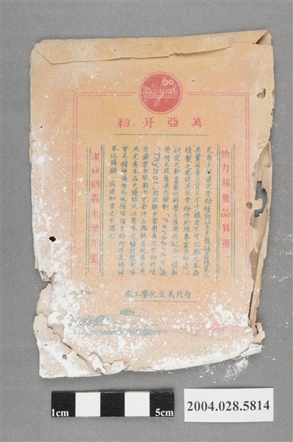 1.本件台北美亞化學工廠製美亞牙粉可分為外包裝袋與紙袋裝牙粉共2部件,呈長9.9公分,寬13.6公分,高0.8公分。外包裝袋作表面彩色印刷,邊緣黏貼呈上開口之直式長方形信封袋狀,邊緣與表面帶有蟲蛀破損痕跡,內包裝之牙粉撒出。正面以黃色為底作紅色長方形底框,中央設計圓形黃底框,背襯垂直白線等距排列成長方形,框內有紫色成堆花朵,上方印「MEIYAH DENTALPOWDER」紅字。左側直書「固齒去垢,質料純貴」,右側「牙科博士,推選靈品」。上端印製「美亞牙粉」名稱,左上角斜印「特製品」藍字。底端為「亞美化學工廠出品」之中英文字樣。背面以雙層紅線成框,頂邊中央帶有圓形紅底框內印「MeiYah」書寫體右上裝飾2朵花卉。框內左右側為「效力超眾品質第一,潔齒防蟲永絕牙患」標語,上端為「美亞牙粉」,中央處印有產品說明文字,下端「台北美亞化學工廠」,左下側則為工廠圖樣。2.本件牙粉為清潔牙齒之用,呈粉末狀,使用時以牙刷沾取。