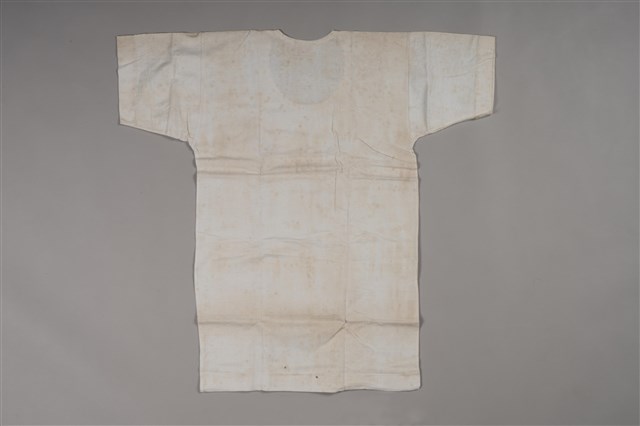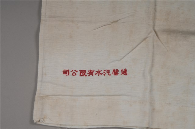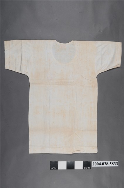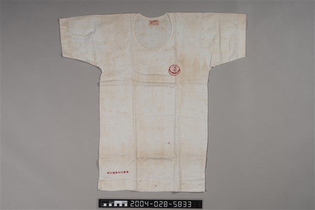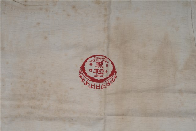 這件短袖上衣是以白色棉質面料製作,在前身印有黑松標誌,推測其為黑松企業的工作服,整件服裝的圓領部分以斜條包車處理,簡單的剪接平袖,是典型的工作服上衣。在此服裝有二個時代的標籤,一是黑松公司,一個是三槍牌;背領上的三槍牌的商標內衣是中興紡織(成立於1949年)自創的品牌,而黑松企業是1925年由張氏家族所創立。服裝前面左上方印有「黑松」的註冊商標,是一個瓶蓋的形狀,非常明顯的品牌意象。服裝右下側印有「進馨汽水有限公司」的字樣,黑松公司初名為進馨商會,1946年進馨飲料改組為「進馨汽水有限公司」,因此可以約略估算此件服裝的生產年代。