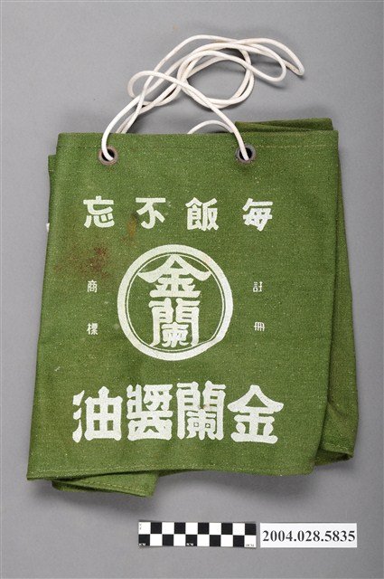 本件金蘭醬油綠色帆布手提袋為公關禮品,整體以綠色帆布製作,外型呈長方形底部,橢圓形袋口,口緣處等距環繞附有金屬圓孔,以繩索穿繞後,作束口袋樣式,繩索部分可當提繩使用。手提袋呈長27.3公分,寬29.9公分,高3.2公分,雙面作相同版面設計,皆以白色印刷。上端印有「每飯不忘」標語,中央處以雙圓環框內印「金蘭」字樣為註冊商標,下端則印有「金蘭醬油」。