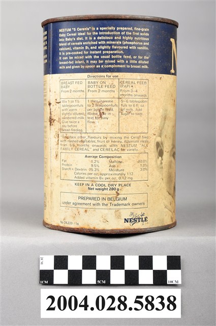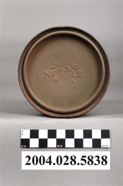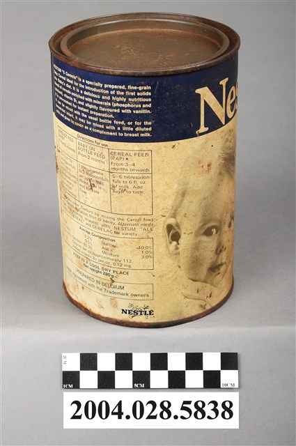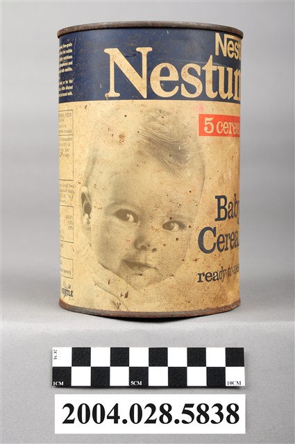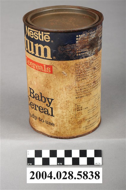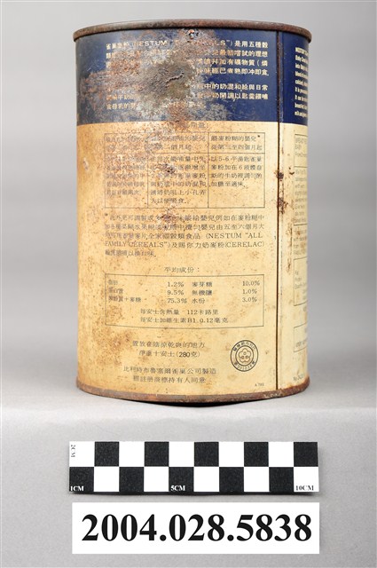 本件雀巢公司製麥粉鐵罐可分為罐身與罐蓋2部件,僅罐身面作彩色印刷,上下端面為金屬原色,呈長10.1公分,寬10.1公分,高14.9公分之圓筒狀。鐵罐表面現已略帶點狀生鏽痕跡。罐身版面以白色底為主,上邊緣以深藍色帶狀裝飾。正面上端以白字印有「Nestlé Nestum」,下方左側以灰階西洋嬰兒之頭像照片為主視覺,右上方作紅底橫式長方形框,內印「5 cereals」,下方以藍色印有「Baby Cereal ready to use」。其背面左右則作中文與英文說明文字、食用方法、成分說明等相關資訊。罐蓋面中央處印有壓印凸紋雀巢商標,底面處則打印有「1003 70A」數字。