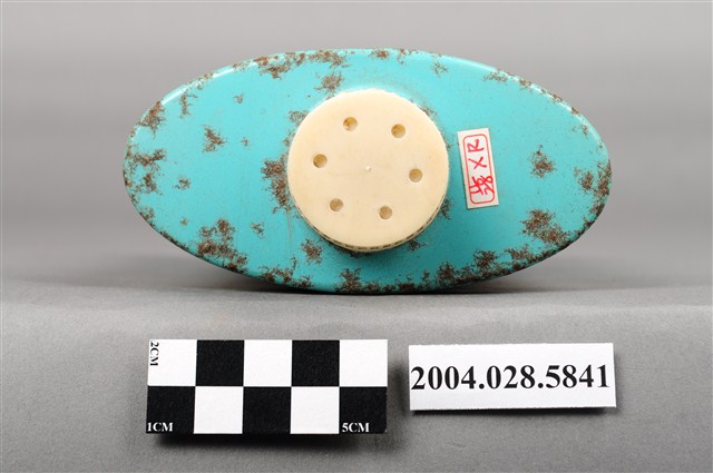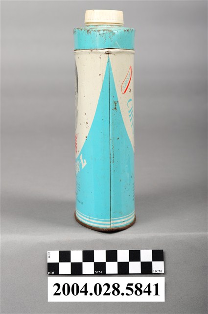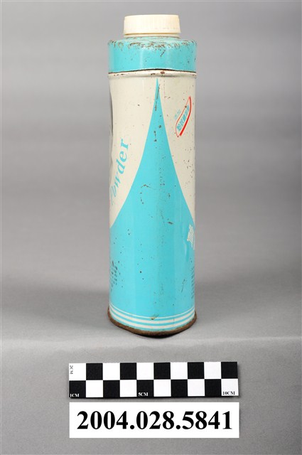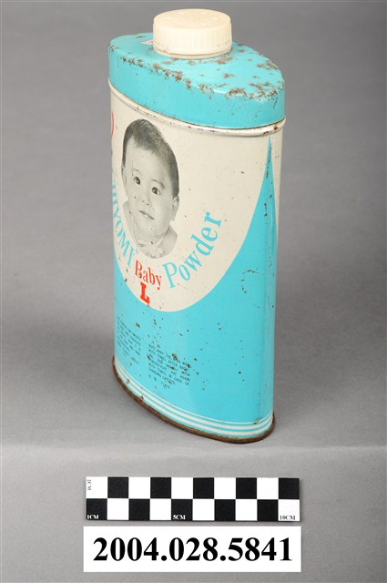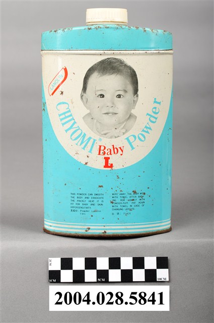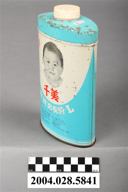 本件臺灣君代化工社製千美寶寶爽身粉以鐵罐裝盛,呈長11公分,寬5.5公分,高18.5公分之橢圓形長扁罐,頂端另裝有圓形塑膠蓋,使用時轉動罐蓋面,以左右旋轉方式打開或關閉等距排列之6個圓孔。罐面以淡藍色為底,正面與背面皆設計相同版面,分別印刷中文與英文。正面上3分之2處作白色半圓底框,框內中央印有黑白嬰兒正面肩像,其下方帶有紅色「千美」字樣,其左側印有紅框內印「添加粉狀綿羊油」。白框外緣則有「寶寶爽身粉-L」名稱,下方則以黑字印上說明文字與使用方式。另有「台灣君代化工廠」與「台中縣外埔鄉水美路68-45號」之工廠與地址。罐底貼有化粧品查驗證貼條。