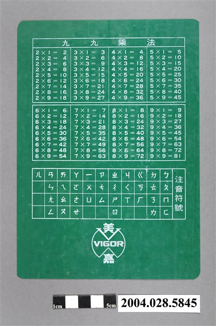 本文物為16K學生墊板,正面有女孩捧花及花朵蝴蝶圖樣,背面有九九乘法表、注音符號表、英文字母表,另有「美嘉/VIGOR」商標。