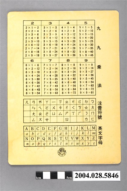 本文物為16K學生墊板,正面有兒童及可愛貓狗圖樣,以及「你好」字樣,背面有九九乘法表、注音符號表、英文字母表,另有「明星牌/STAR」商標。