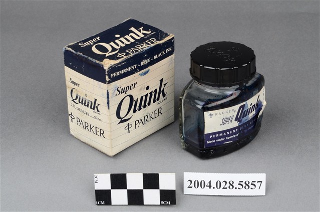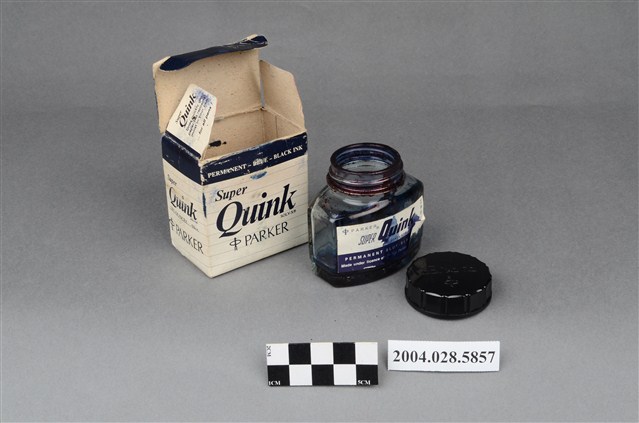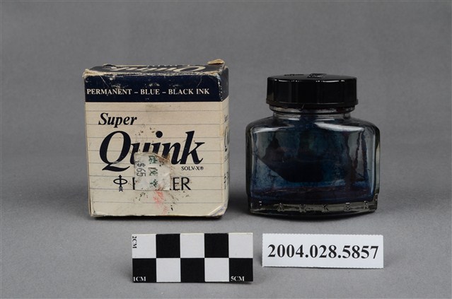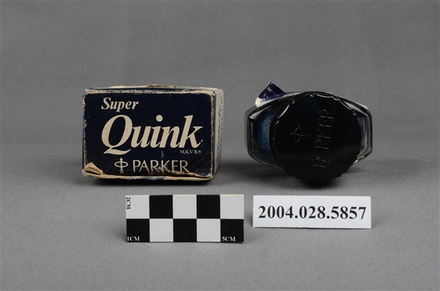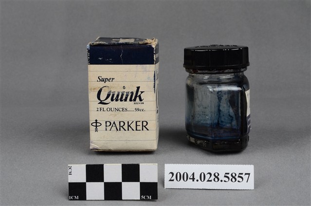 本文物為PARKER/派克瓶裝藍黑色墨水瓶(含外盒),派克鋼筆公司(Parker Pen Company)1888年由喬冶‧斯坦福‧派克於美國威斯康辛州簡斯維爾市成立,是歷史悠久的製筆公司。本物件為臺灣製造,外盒包裝標籤完整。