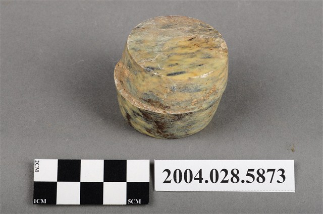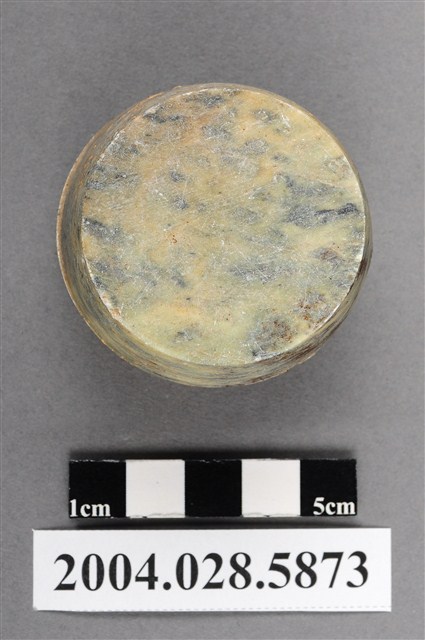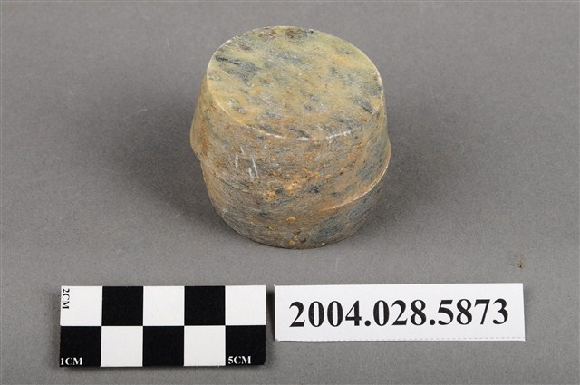 1.本件為花蓮支亞干遺址採集之磨製圓形玉核,材質為綠色閃玉,直徑5.2cm、厚3.7cm,器形為圓柱體,兩端分別以圓形旋截的加工方式向中央旋磨,但在中央處錯開並形成明顯的崩折痕,器物表面加工磨平,十分光滑。