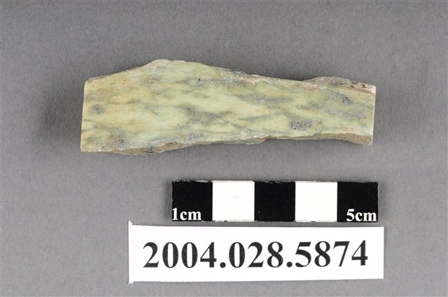 1.本件為花蓮支亞干遺址採集之玉器加工廢料,磨製,材質為綠色閃玉,器長6.7cm、寬2.4cm、厚2.2cm,器形為長方形,但一端較寬,另一端較窄,兩側邊也不平整,器物表面打磨得相當平滑並留有切割崩折的痕跡。