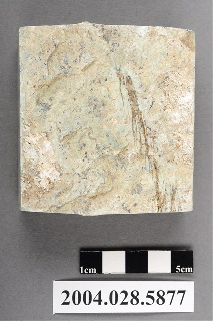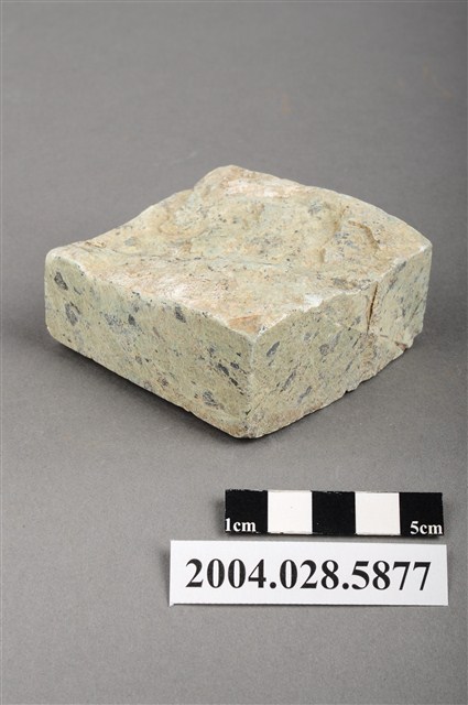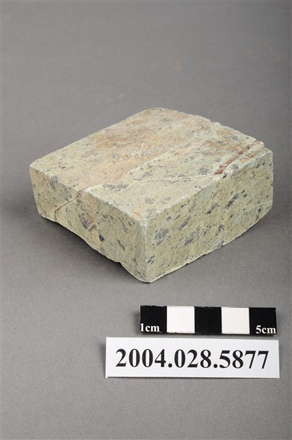 1.本件為花蓮支亞干遺址採集之玉器加工廢料,磨製,材質為綠色閃玉,器長7.7cm、寬7.3cm、厚3.4cm、器形為方形,器物表面夾雜黑色斑點並有裂痕,器身上、下二面不平整,其中一面留有切磨崩鋸的痕跡,其他面打磨的相當平整光滑。2.本件器物的材質常被史前人類用來製作工具或裝飾品使用,為成品加工剩餘之廢料,在臺灣的史前遺址常可發現,尤其在花蓮坪林遺址發現的數量相當多,推測可能是石器加工場。
