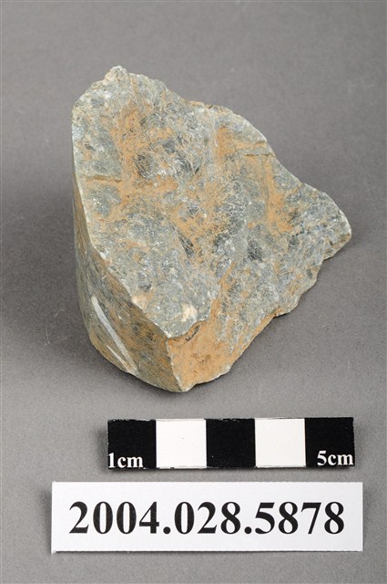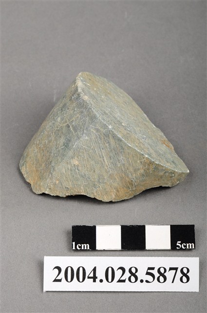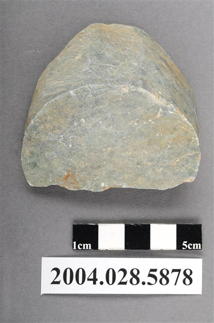 1.本件為花蓮支亞干遺址採集之八角形玉核,長6.6cm、寬4.6cm、厚4.5cm、器物表面先切磨成多面體,再加以修整成圓形,在器壁上有數道平行排列如浮雕的弧型刻紋,可能是圓管工具鑽鑿留下的製作痕。器物另一面為未經加工的粗糙面。2.本件器物的材質常被史前人類用來製作工具或裝飾品使用,為成品加工剩餘之廢料,在臺灣的史前遺址常可發現,尤其在花蓮坪林遺址發現的數量相當多,推測可能是石器加工場。