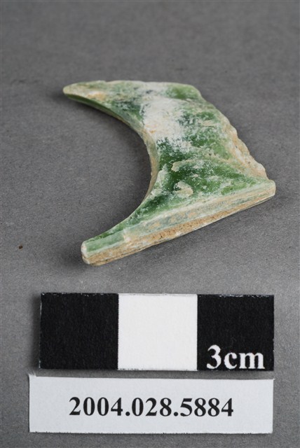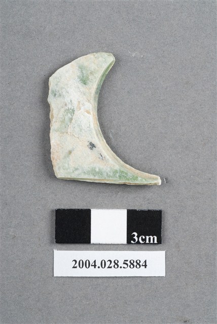 1.本件為花蓮支亞干遺址採集之切割玉料,磨製,材質為綠色閃玉,器長3.8cm、寬3cm、厚0.4cm,為加工環玦等玉器剩下之廢料,沒有固定的形制。由於本件器物曾使用圓形旋截的加工方式,周緣的磨鋸痕為半圓形,另一側留下平直的磨鋸痕。