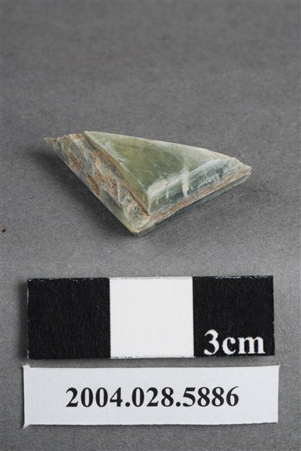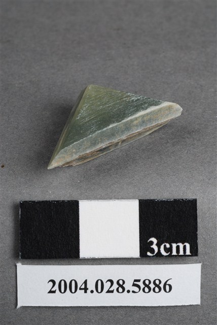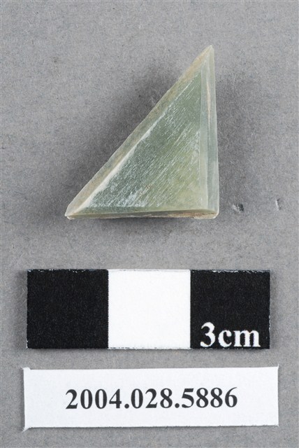 1.本件為花蓮支亞干遺址採集之切割玉料,磨製,材質為綠色閃玉,質地精美,器長2.7cm、寬1.4cm、厚0.7cm,器形為三角形,器物表面經過切磨和崩折的痕跡均相當明顯,為製作器物時剩下之角料。