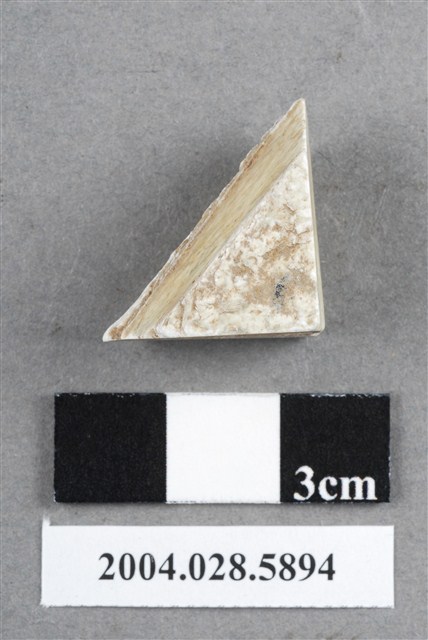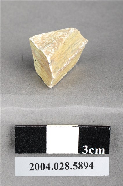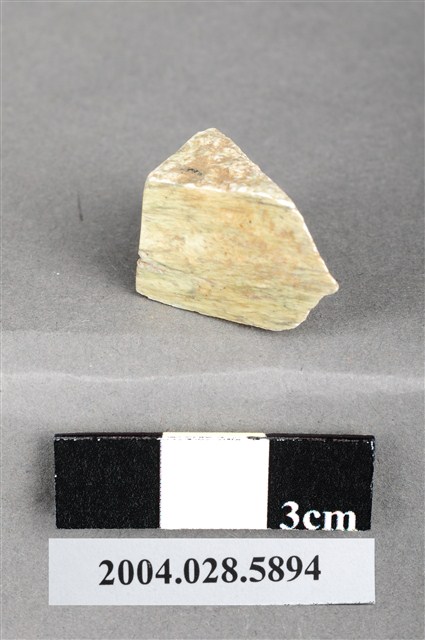 1.本件為花蓮支亞干遺址採集之玉器加工廢料,磨製,材質為灰綠色閃玉,器長2.7cm、寬1.5cm、厚1.3cm,器形為三角形,器物表面磨平並留下崩折的製作痕,但兩個三角面並未經修整。2.本件器物的材質常被史前人類用來製作工具或裝飾品使用,為成品加工剩餘之廢料,在臺灣的史前遺址常可發現,尤其在花蓮坪林遺址發現的數量相當多,推測可能是石器加工場。