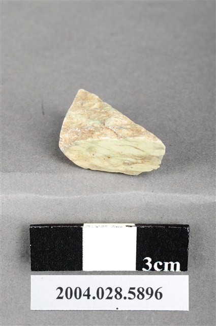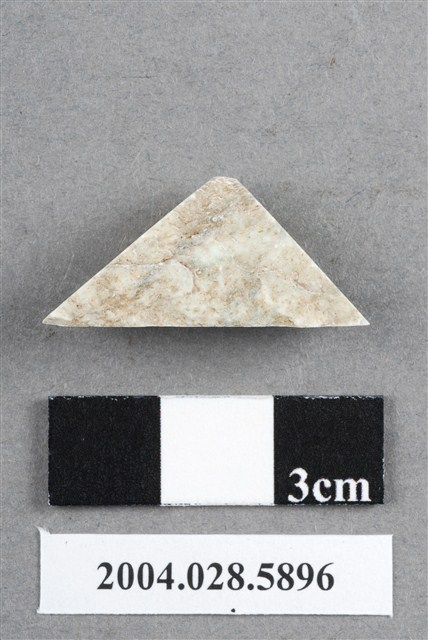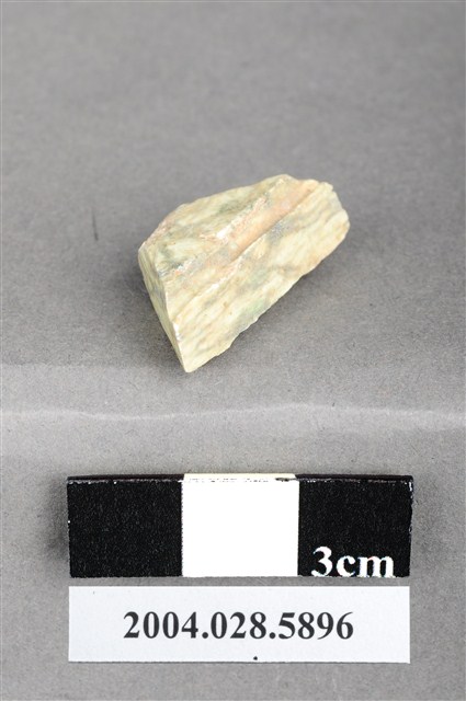 1.本件為花蓮支亞干遺址採集之玉器加工廢料,磨製,材質為灰綠色閃玉,器長2.8cm、寬1.3cm、厚0.9cm,器形為三角形,器物表面磨平並留下崩折的製作痕,但兩個三角面並未經修整。2.本件器物的材質常被史前人類用來製作工具或裝飾品使用,為成品加工剩餘之廢料,在臺灣的史前遺址常可發現,尤其在花蓮坪林遺址發現的數量相當多,推測可能是石器加工場。