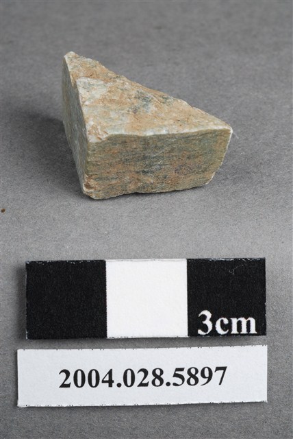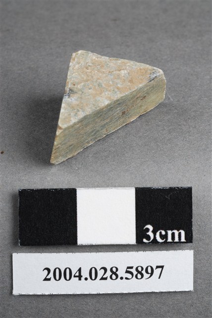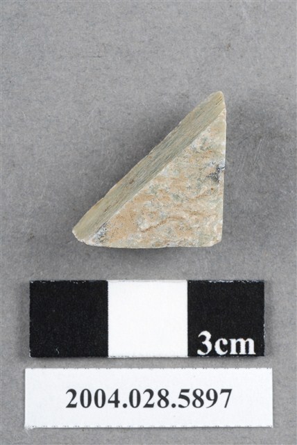 1.本件為花蓮支亞干遺址採集之玉器加工廢料,磨製,材質為灰綠色閃玉,器長2.6cm、寬1.3cm、厚1.1cm,器形為三角形,器物表面磨平並留下崩折的製作痕,但兩個三角面並未經修整。2.本件器物的材質常被史前人類用來製作工具或裝飾品使用,為成品加工剩餘之廢料,在臺灣的史前遺址常可發現,尤其在花蓮坪林遺址發現的數量相當多,推測可能是石器加工場。