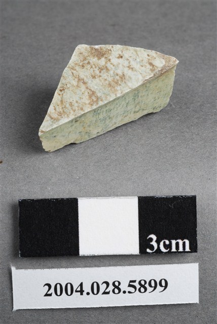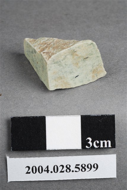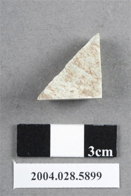 1.本件為花蓮支亞干遺址採集之玉器加工廢料,磨製,材質為灰綠色閃玉,器長2.7cm、寬1.4cm、厚1.2cm,器形為三角形,器物表面磨平並留下崩折的製作痕,但兩個三角面並未經修整。2.本件器物的材質常被史前人類用來製作工具或裝飾品使用,為成品加工剩餘之廢料,在臺灣的史前遺址常可發現,尤其在花蓮坪林遺址發現的數量相當多,推測可能是石器加工場。