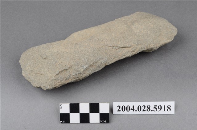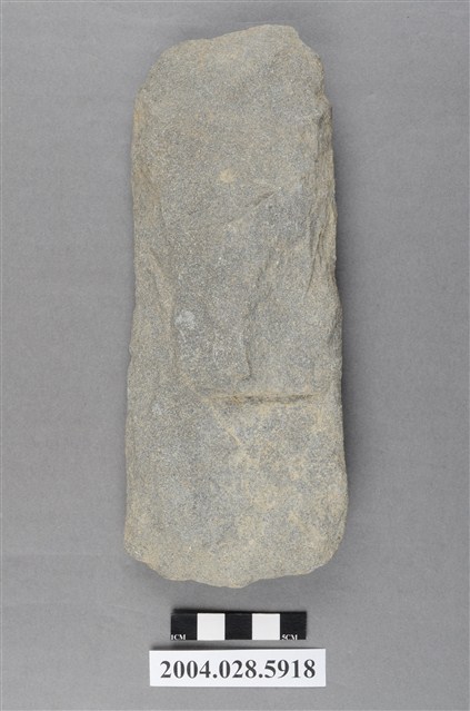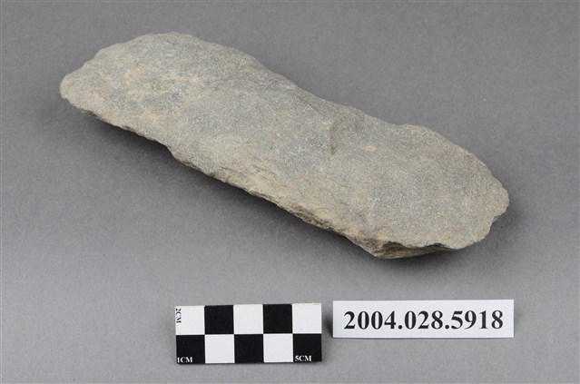 1.本件為臺東樟原遺址採集之打製石斧,材質為灰色砂岩,器長19.2cm、寬7.7cm、厚3cm,器形為長方形,保存完整,器身表面經過打剝修整,柄部有缺損,刃部為中鋒,經使用有明顯的消耗痕。