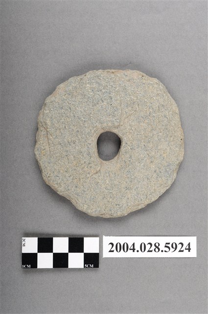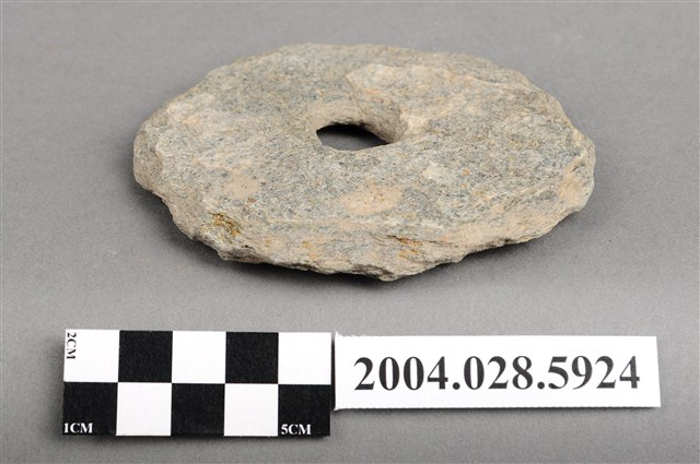 1.本件為花蓮支亞干遺址採集之打製帶穿圓板,材質為石英雲母片岩,圓形直徑9.9cm,厚1.2cm,器壁厚度均勻,器身周緣經過打剝修整成圓形,但未經打磨,因此表面粗糙,從器物表面看不出使用的痕跡。器物中央加工鑿出一個圓孔。