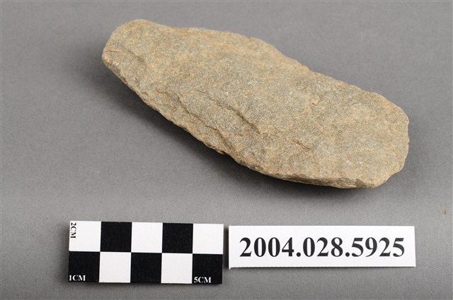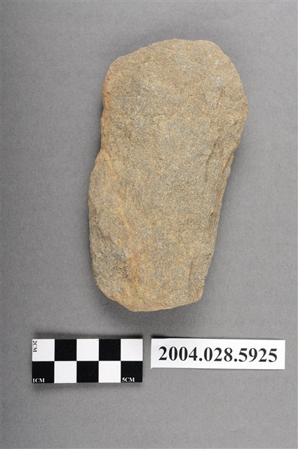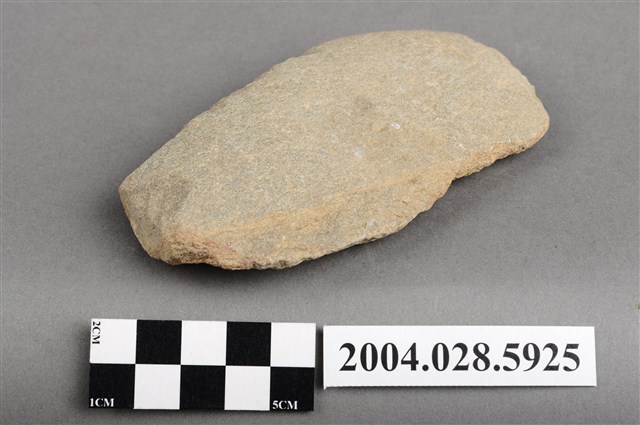 1.本件為臺東東河遺址採集之打製石斧,材質為灰色砂岩,器長12.5cm、寬6.6cm、厚2.2cm,器形為長方形,保存完整,器身一面保留原來之石皮,另一面經過打剝,兩側邊並不工整,柄部甚厚,刃部為中鋒,刃端呈圓弧形,有使用痕。2.打製石斧常見於臺灣的史前遺址,為史前人類用作劈砍的工具,使用前於器身柄端以線繩纏繞綁縛木柄使用。由於石斧在地層中埋藏幾千年後,木柄的部分已腐爛風化,只剩下石質部分遺留下來。