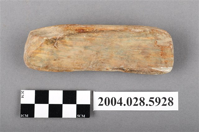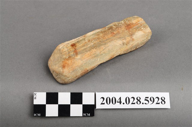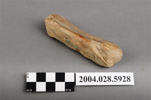 1.本件為花蓮支亞干遺址採集之打拋磨石,材質為灰綠色蛇紋岩,長10.5cm,寬3.6cm、厚2.5cm,器形為長條形,利用天然的石材面修製拋光陶器的表面,可以將器物表面磨平,但僅其中一面經過細磨,形成平滑的凹面,其他面均未經磨製,維持石材原貌。