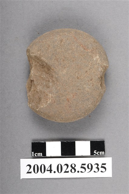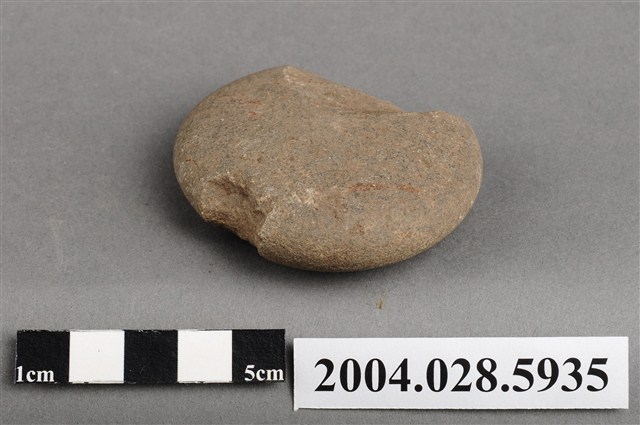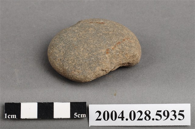 1.本件為臺東南八里遺址採集之打製砝碼型石網墜,材質為灰色變質砂岩,長5.5cm、寬6.2cm、厚1.9cm,器形為扁圓形,本件器物由扁圓礫石簡單製作而成,表面未經加工,僅在器身兩側中央敲擊,形成相互對稱的凹槽,凹槽一大一小。2.打製砝碼型石網墜常見於臺灣的史前遺址,為史前人類用來綁在漁網上進行漁撈活動時使用的工具,因漁網埋藏地層中數千年之久,纖維質已經腐爛不見,只有石質部分遺留下來。