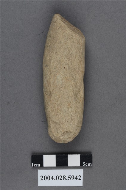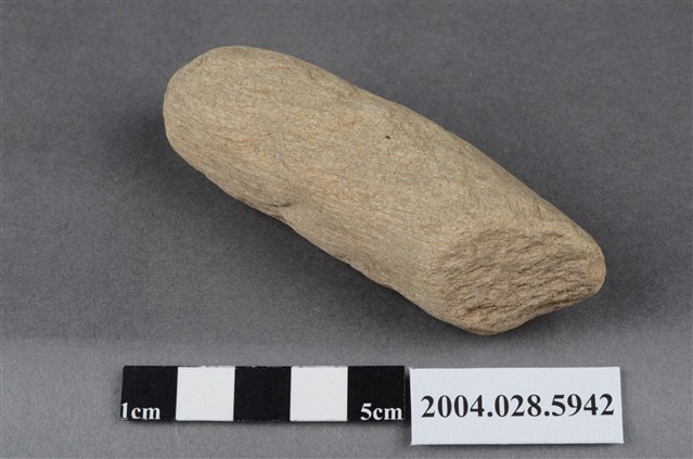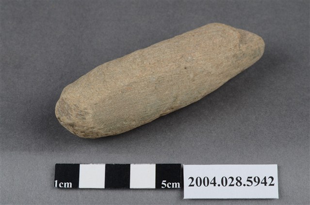 1.本件為花蓮支亞干遺址採集之樹皮布打棒,材質為灰色片岩,長10.3cm、寬3.4cm、厚2.8cm,器形為長條形,器身並不圓,表面經打剝修整,並將一側整磨,但局部保留石材原狀。一端突出,經過錘擊使用,另一端為相當厚的斜面。2.石杵為史前人類用來舂穀去殼的工具,使用前用繩索綁縛在木柄上舂打,由於木質部分埋藏地下過久,已經腐爛不見,只有石質部分遺留下來。