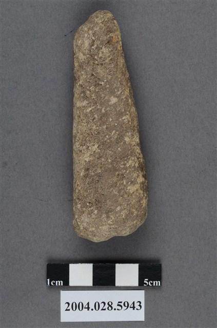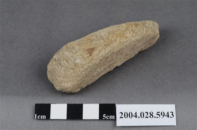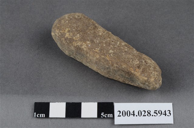 1.本件為花蓮支亞干遺址採集之石鎚,材質為灰色片岩,長9.8cm、寬3.2cm、厚3.2cm,器形為長條形,器身未經打剝修整,保留石材原狀。一端較細,另一端較粗,均經過錘擊使用。2.石鎚常見於臺灣的史前遺址,為史前人類用作敲碎獸骨或貝類等物品的工具,使用時直接抓握在手上使用,另可做釘錘使用。