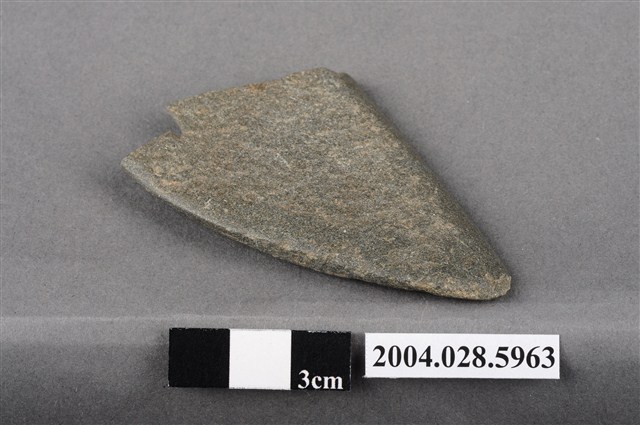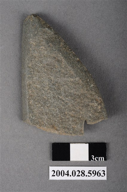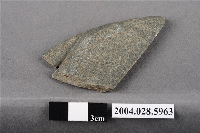 1.本件為臺東樟原遺址採集之磨製石刀,長6.6cm、寬4.7cm、厚0.8cm,材質為砂岩,型制為半月型伐孔石刀,保存不完整,僅存半件,另一半已經缺損,石刀表面經過啄打修整但只有刃部及其他側邊經過磨平,並在器身上切磨出一道伐孔,但穿孔已經破損。刃部為偏鋒。2.磨製石刀常見於臺灣的史前遺址,為史前人類用來收割摘取穀類穗部的工具,使用前於器身圓孔上穿上線繩使用。由於石刀在地層中埋藏幾千年後,線繩纖維的部分已腐爛風化,只剩下石質部分遺留下來。