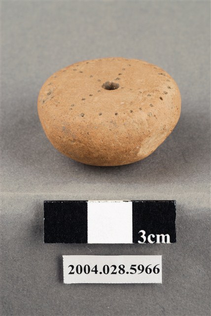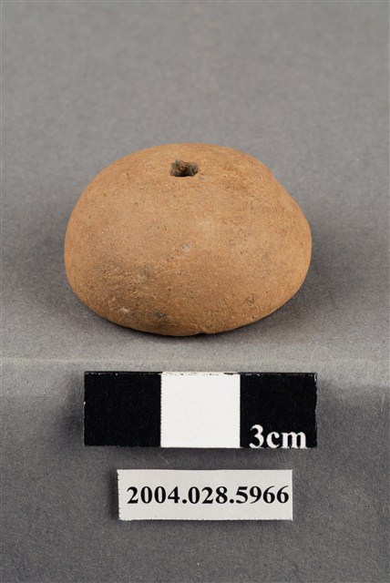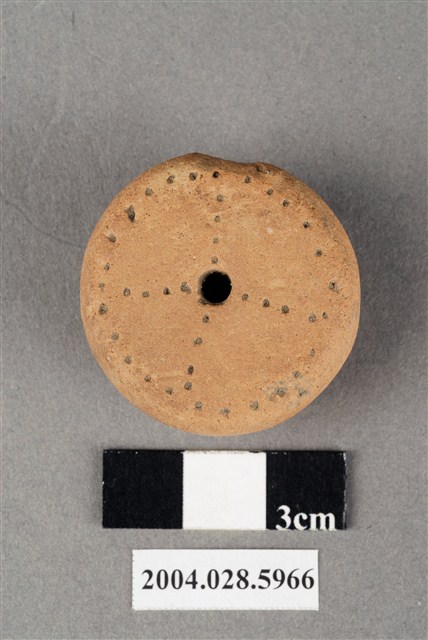 1.本件為臺東杉原遺址採集之陶紡輪,為夾砂紅陶,使用含摻和料的陶土燒製而成。型制為圓錐形,直徑3.3cm、厚1.8cm,錐體部分僅單面且表面圓鼓,底面壓印實心圓點排列而成的單一圓圈紋結合十字型的紋飾。器物正中央有一空心穿孔。2.陶紡輪常見於臺灣的史前遺址,為史前人類用來紡線的工具,使用時將圓棒放置於穿孔中,將植物纖維紡成線後再紡織成布使用。由於陶紡輪埋藏地層中數千年,木質部分已經腐爛不見,只有陶質部分遺留下來。