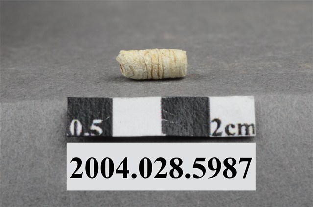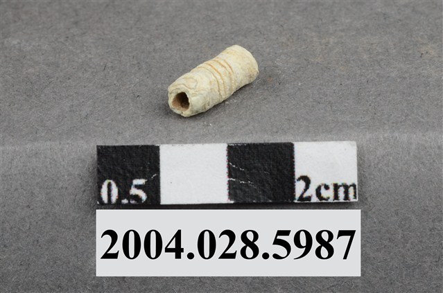 1.本件為花蓮港口遺址採集之貝管珠,形制為圓形,長0.7cm、管徑0.3cm,經磨製而成,表面勻稱,呈現灰綠色夾雜褐色圈紋,有一中空的圓孔,兩端並不平整。2.管珠常見於臺灣的史前遺址,大多為史前人類的裝飾品,材質最常使用的是美麗的玉石,貝製品較不常見。