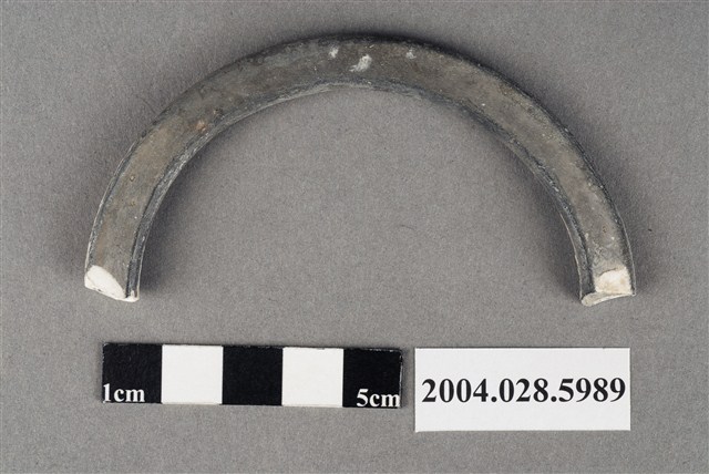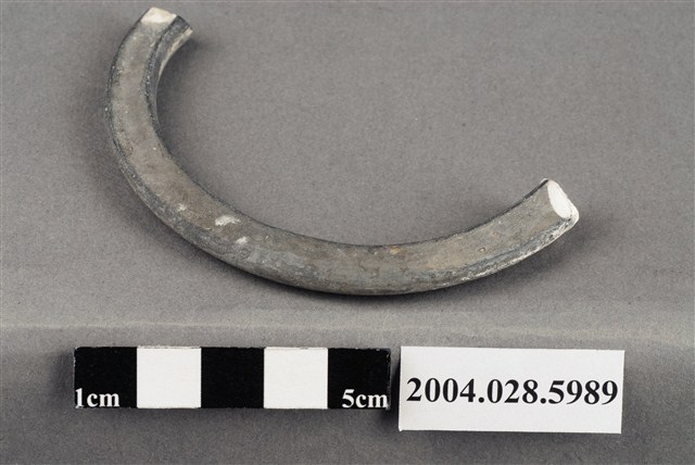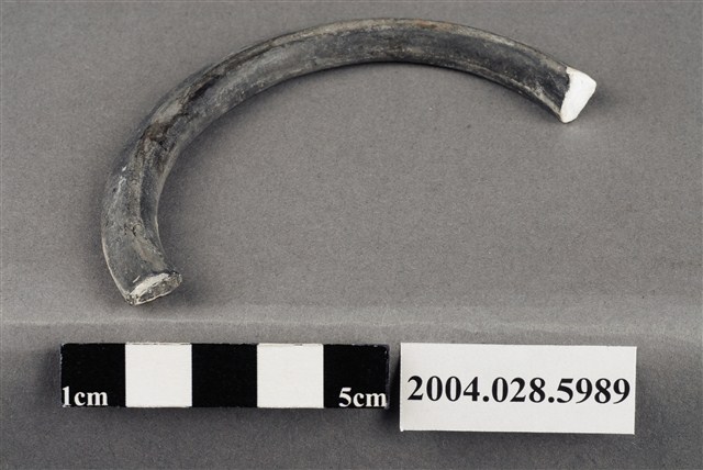 1.本件為臺南烏山頭遺址採集之陶環,器形為圓形,已經破損,剩下二分之一,長9cm、寬4.4cm、厚0.7cm,為泥質灰黑陶,斷口仍可見未燒透之灰色內胎。表面抹平並捏塑出梯形,燒製完成之色澤尚稱均勻。2.陶環常見於臺灣的史前遺址,以顏色來分大致可分為紅、黑陶兩種,史前人類將陶環佩戴在手上作為飾品使用,也可以用來陪葬。