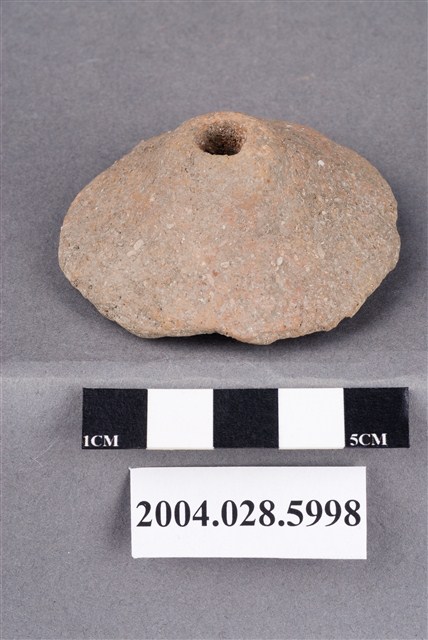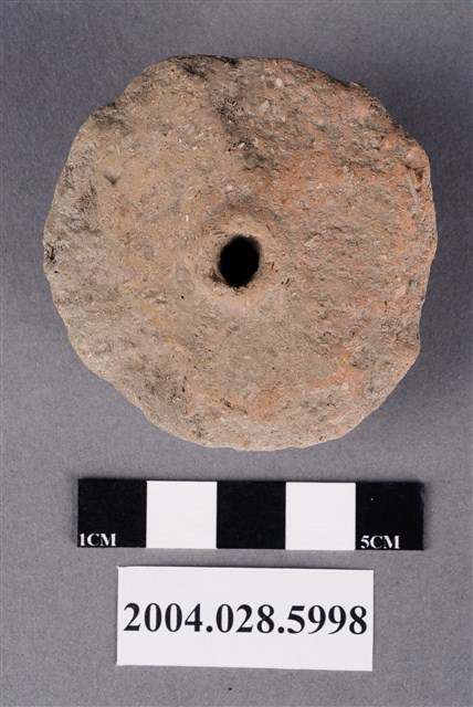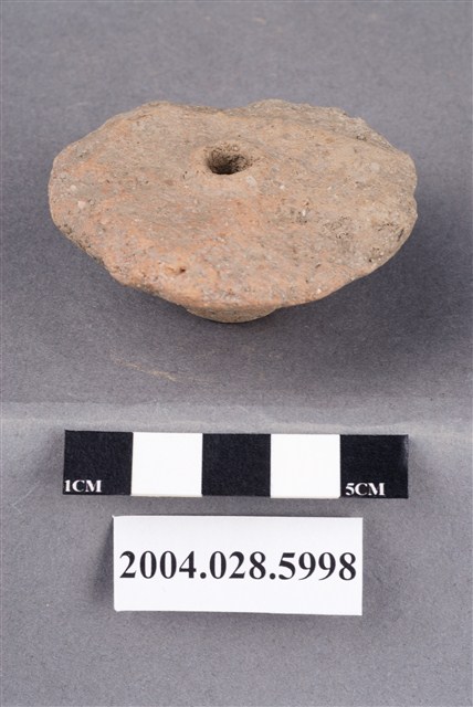 1.本件為臺東興昌遺址採集之陶紡輪,為夾砂紅陶,使用夾雜大量板岩等變質岩粗砂的陶土燒製而成,顯然是外來的物品,型制為尖錐形,直徑5.2cm、厚2.5cm,錐體部分僅單面突出,器物表皮脫落且底面殘損,正中央有一中空圓孔。2.陶紡輪常見於臺灣的史前遺址,為史前人類用來紡線的工具,使用時將圓棒放置於穿孔中,將植物纖維紡成線後再紡織成布使用。由於陶紡輪埋藏地層中數千年,木質部分已經腐爛不見,只有陶質部分遺留下來。