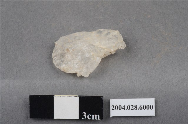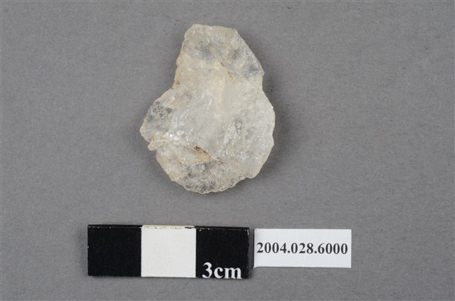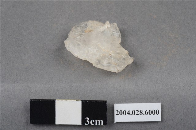 本件為花蓮支亞干遺址採集之小石片,長3.1cm、寬2.5cm、厚0.7cm,器型不規則,為兩極工法製造,未見使用過的痕跡。