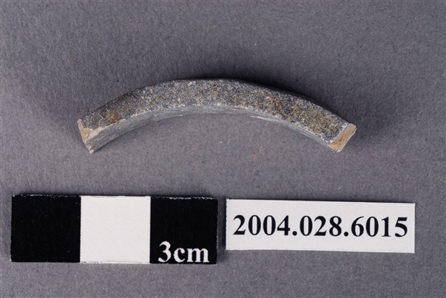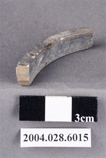 1.本件為花蓮支亞干遺址採集之磨製玉環,材質為閃玉,器長3.9cm、寬1.1cm、厚0.9cm,器形為圓形,但已經斷裂,殘存約六分之一,器物經圓形旋截加工而成,經細磨後,表面平滑。2.石環常見於臺灣的史前遺址,在臺東卑南遺址出土的數量相當多,但其他史前遺址並不常見,為史前人類佩戴在手上的裝飾品∘