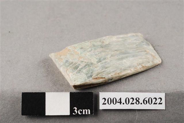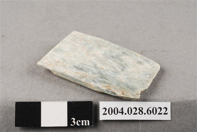 1.本件為花蓮支亞干遺址採集之磨製玉錛,長4.5cm、寬2.7cm、厚0.4cm,保存完整,材質為閃玉,器物表面經過打磨,相當平滑,器身很薄,柄部及側邊有明顯的鋸崩痕且未經磨平。刃部為偏鋒,刃端鋒利但部分殘損。2.磨製石錛常見於臺灣的史前遺址,但材質為臺灣玉者少見,通常做為陪葬品使用。石錛為史前人類用來刨削木材或刮除皮脂,屬於木工工具,使用時在柄部用線繩綁縛木製把手,因石錛埋藏地層中數千年,木質部分已腐朽不見,只有石質部分留存下來。