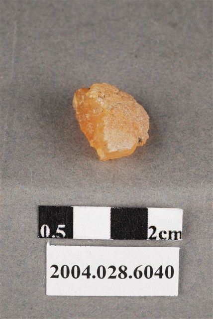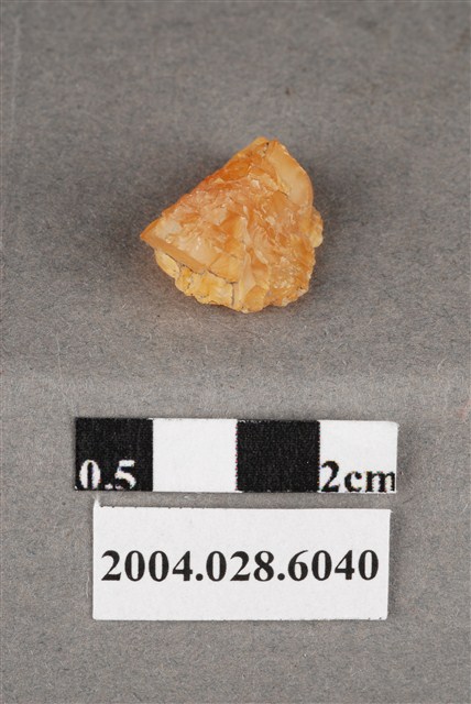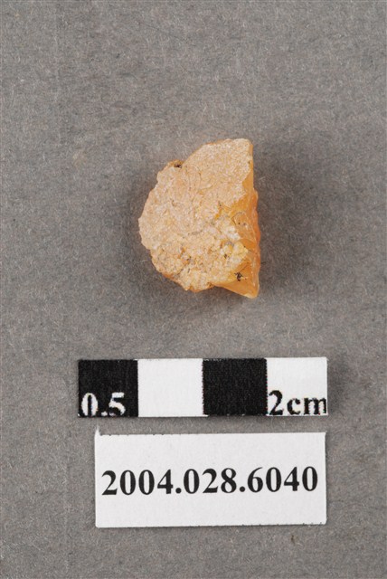 本件為花蓮港口遺址採集之石英片岩,長1.2cm、寬1cm、厚0.6cm,器形近三角形,為天然裂解成片狀,但未經打磨,一面保留原石皮,往周緣變薄,未見使用過的痕跡。