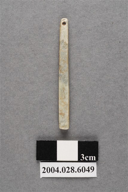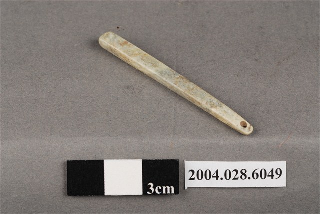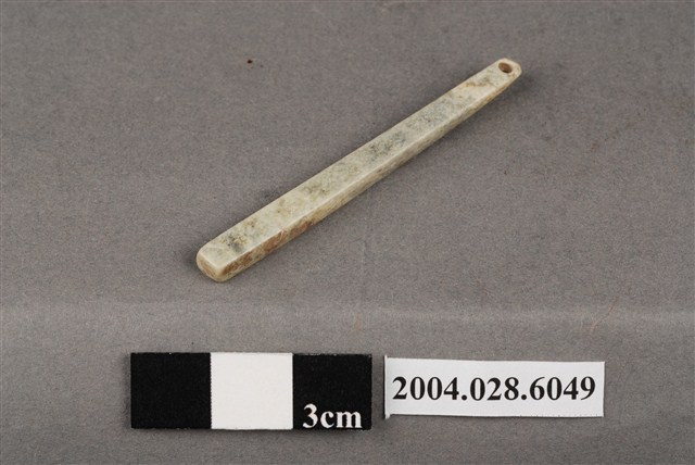 1.本件為臺東長光遺址採集之玉墜,材質為臺灣玉,器形為長方形,長5.3cm、寬0.5cm、厚0.3cm,保存完整,器身勻稱,表面光滑,側邊方角略經修磨,一端有一圓孔。2.玉墜在臺灣的史前遺址並不常見,為史前人類的裝飾品,利用穿孔串線佩戴在頸部或胸前做為項飾使用,由於埋藏於地層中數千年,線繩已經腐爛不見,只有石質部分遺留下來。