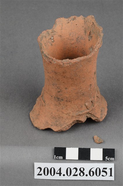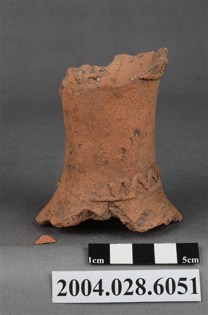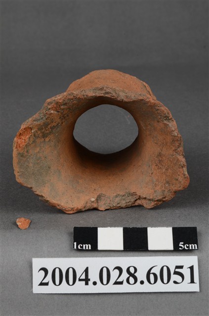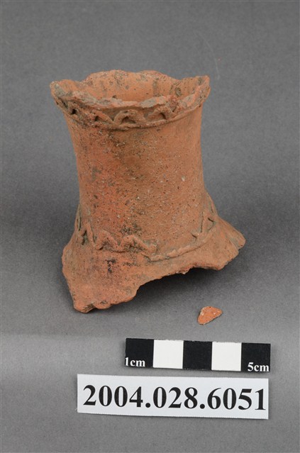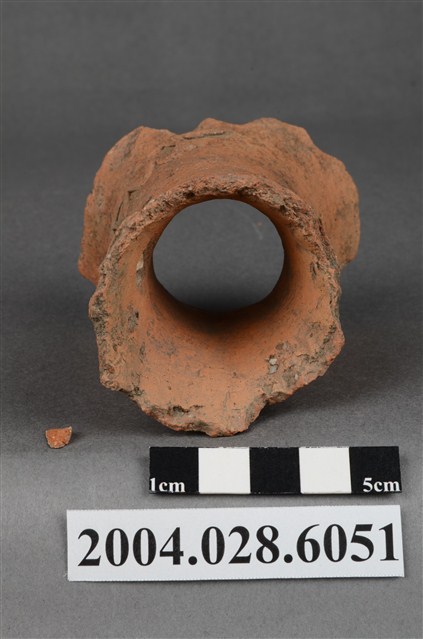 1.本件為花蓮港口遺址採集之陶瓶瓶頸,呈細長狀,長8.6cm、高5.5cm,質地為夾砂紅陶,類似所謂的阿美陶。陶土中參雜肉眼可見的細砂顆粒,但器壁表面經過塗泥抹平,且器壁很薄,雖燒製的火候不高,但內胎燒透成紅色,外壁表面於抹平後再附加三角形相連之紋飾,上下各有一圈帶狀紋飾,局部已經殘缺不見。2.陶瓶在臺灣的史前遺址並不常見,為日常生活中盛水或祭祀用,另也可能作為陪葬用品使用。
