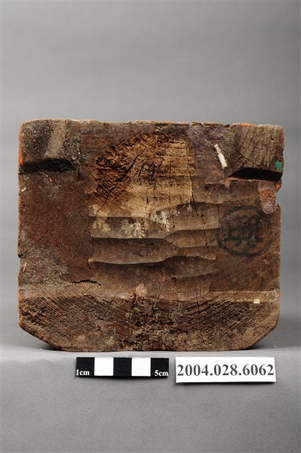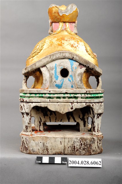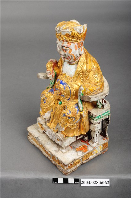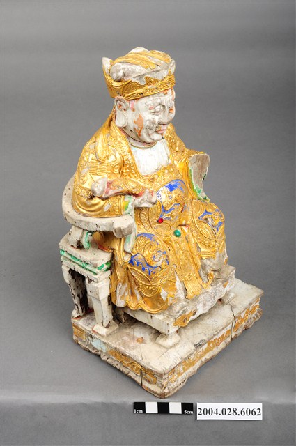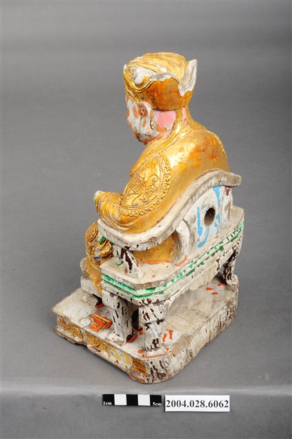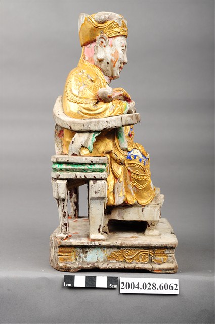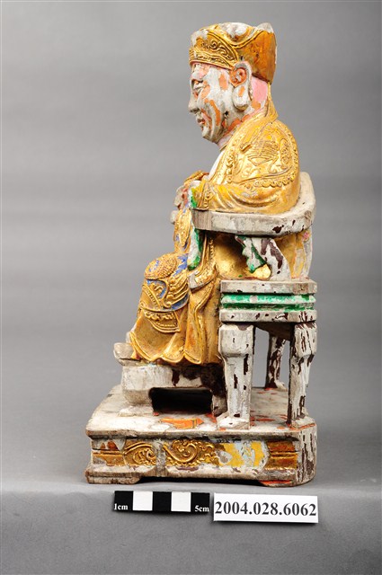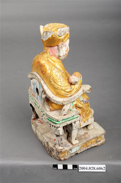 土地公又稱福德正神,部分地區也稱為伯公、后土、社神、土地神等。土地公傳說眾多,一般人生前行善,死後亦有被封為土地公者。土地公不僅掌一境之地,也被視為是文財神。本件土地公頭戴冠帽,身穿補子為鶴鳥之朝服,右手持如意。左手及圈椅扶手已缺損,腳踏及圈椅背及底座漆層大多脫落。椅背後有一孔應為入神孔。