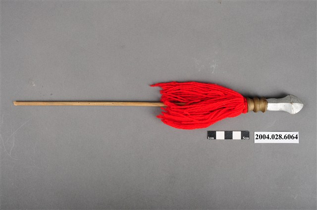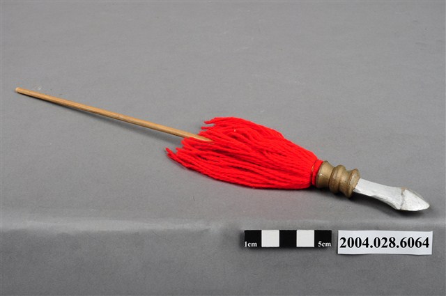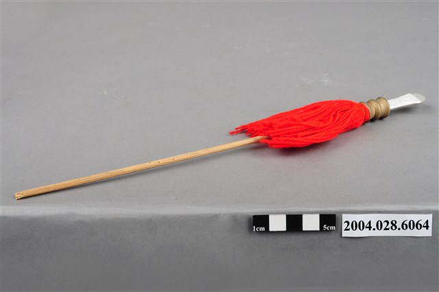 本件為木製長槍,在長柄之上安裝槍頭,連接處裝飾紅纓,槍頭塗上銀漆。槍為長柄武器,此槍體積小,可能當作偶戲人物的道具。