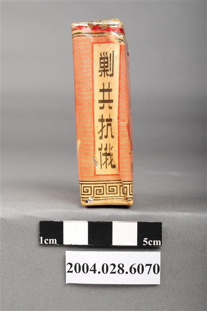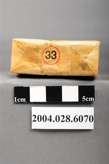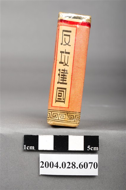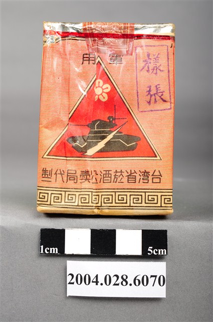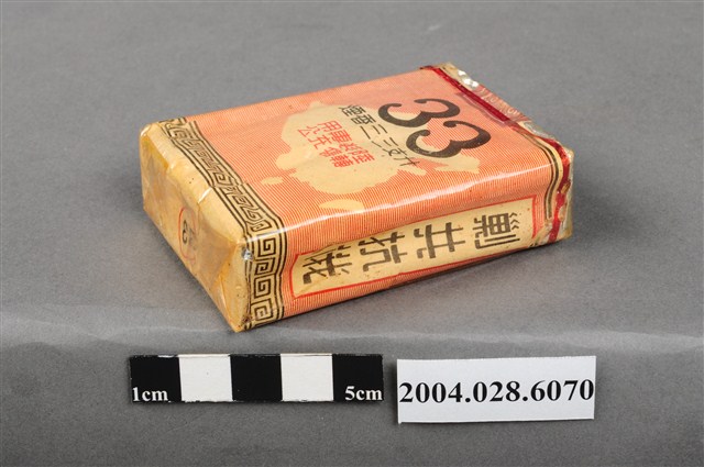1.本物件為「臺灣省菸酒公賣局代製33香煙」,為公賣局代製的軍煙,正面上方文字為「軍用」,中央紅色三角標誌內印有梅花與戰車圖樣,下方文字為「台湾省菸酒公卖局代」,右上角印有一個「樣張」的章。背後背景圖案為中國地圖,上方文字為「33、廾支三三香煙、陸裝專用、轉售充公」。上方封口處貼有貼紙,中間圓形圖案印有數字和英文文字「20、CIGARETTES」,兩邊各印有4字反共口號「反共建國、剿共抗俄」,下方中央則有一個「33」的圓形標誌。