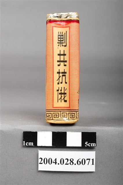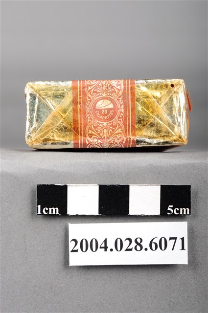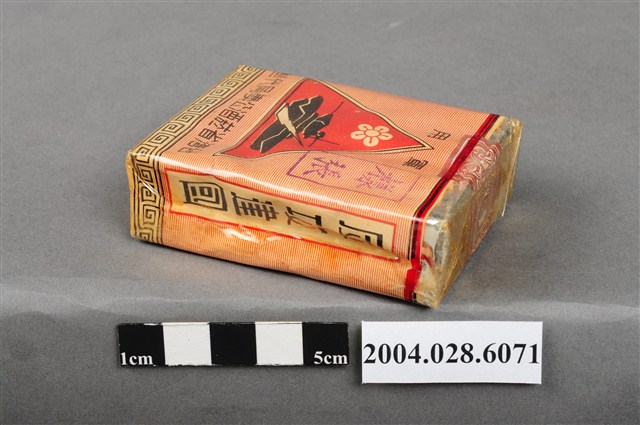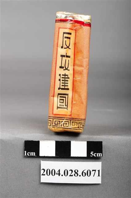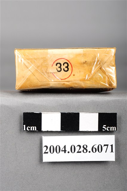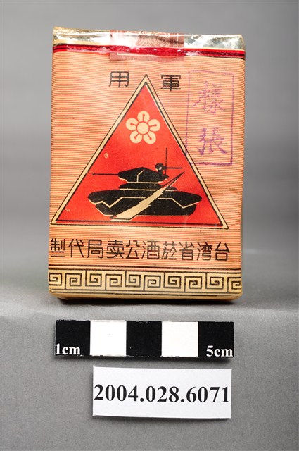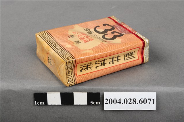 1.本物件為「臺灣省菸酒公賣局代製33香煙」,為公賣局代製的軍煙,正面背景圖案為中國地圖,上方文字為「33、廾支三三香煙、陸裝專用、轉售充公、特」,背後上方文字為「軍用」,中央紅色三角標誌內印有梅花與戰車圖樣,下方文字為「台湾省菸酒公卖局代」,右上角印有一個「樣張」的章。上方封口處貼有貼紙,中間圓形圖案印有數字和英文文字「20、CIGARETTES」,兩邊各印有4字反共口號「反共建國、剿共抗俄」,下方中央則有一個「33」的圓形標誌。
