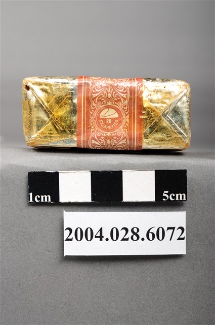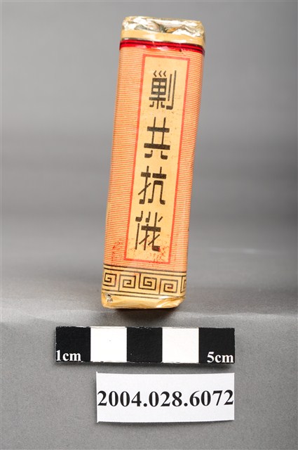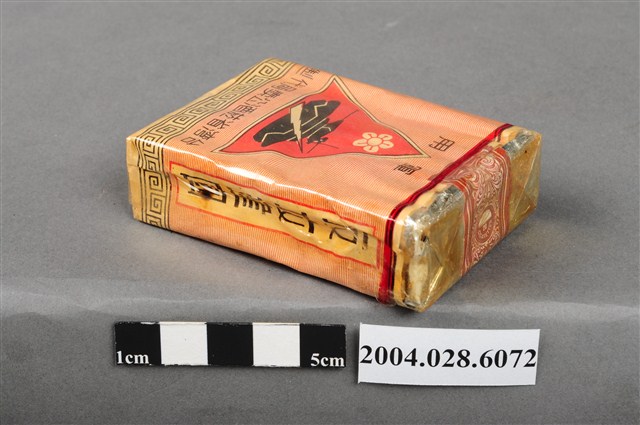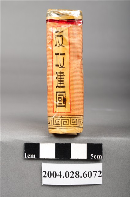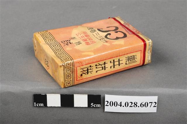 1.本物件為「臺灣省菸酒公賣局代製33香煙」,為公賣局代製的軍煙,正面背景圖案為中國地圖,上方文字為「33、廾支三三香煙、陸裝專用、轉售充公、特、誠」,背後上方文字為「軍用」,中央紅色三角標誌內印有梅花與戰車圖樣,下方文字為「台湾省菸酒公卖局代」。上方封口處貼有貼紙,中間圓形圖案印有數字和英文文字「20、CIGARETTES」,兩邊各印有4字反共口號「反共建國、剿共抗俄」,下方中央則有一個「33」的圓形標誌。